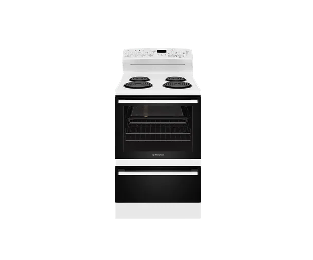 60cm white electric freestanding cooker, with multi-function 5 fan forced oven, digital programmable timer, warming drawer and a 4 zone coil cooktop.