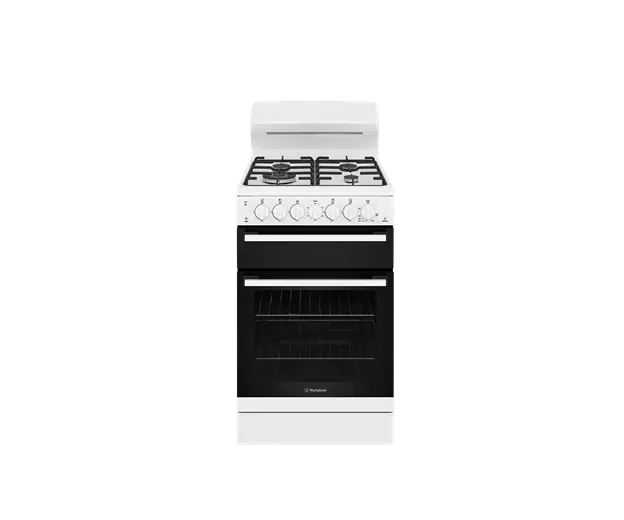54cm white gas freestanding cooker with separate gas grill, conventional gas oven with fan, 60 minute timer and a 4 burner gas cooktop with 14.2 mj/hr wok burner.