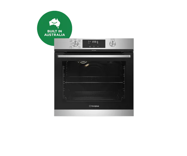 Stainless steel 60cm multi-function 10 stainless steel oven with PyroClean, fast heat up, programmable timer and 80L gross capacity.
