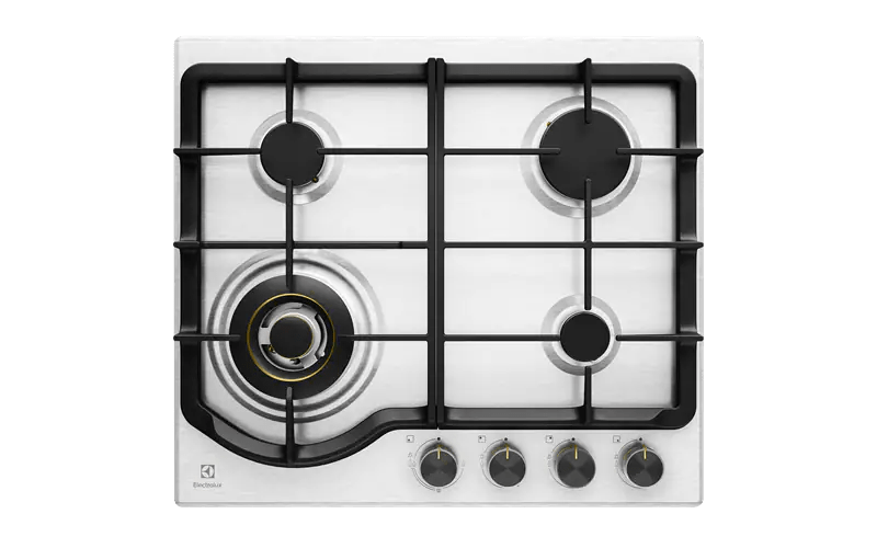 60cm 4 burner stainless steel gas cooktop with 17MJ/hr wok burner, dual flame control and flat cast iron trivets.