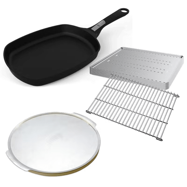 Explore a range of cooking possibilities with this starter pack for your Family Q barbecue. Whether you’re frying eggs and pancakes for breakfast, baking a brownie for morning tea, cooking up a pizza for lunch or roasting a chicken for dinner, this starter pack has all you need. This pack features a roasting trivet and 10 convection trays, a pizza stone with pizza tray and a frying pan with detachable handle – all specially designed and tested for use in your Family Q gas BBQ.