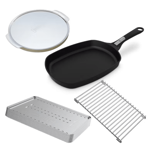 Explore a range of cooking possibilities with this starter pack for your Baby Q barbecue. Whether you’re frying eggs and pancakes for breakfast, baking a brownie for morning tea, cooking up a pizza for lunch or roasting a chicken for dinner, this starter pack has all you need. This pack features a roasting trivet and 10 convection trays, a pizza stone with pizza tray and a frying pan with detachable handle – all specially designed and tested for use in your Baby Q gas BBQ.