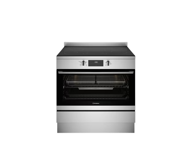90cm electric freestanding oven with 5 zone ceramic cooktop, multi-function 8 oven, AirFry, 125L gross capacity, and Hob2Hood.
