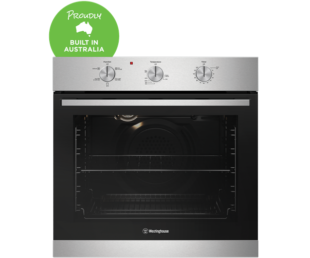 60cm multi-function 5 stainless steel oven with 10 Amp plug, 2 hour auto-off timer, knob controls, and 80L gross capacity.