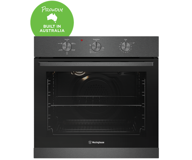 60cm multi-function 5 dark stainless steel steel oven with 10 Amp plug, 2 hour auto-off timer, knob controls, and 80L gross capacity.