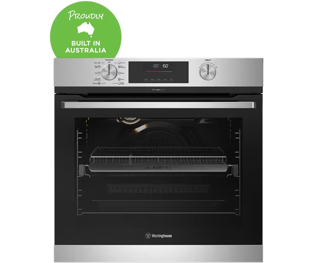 60cm multi-function 10 stainless steel PyroClean oven with AirFry, telescopic runners, programmable timer, and 80L gross capacity.