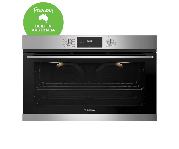 90cm multi-function 8 stainless steel oven with twin fan, fast heat up, programmable timer, and 125L gross capacity.