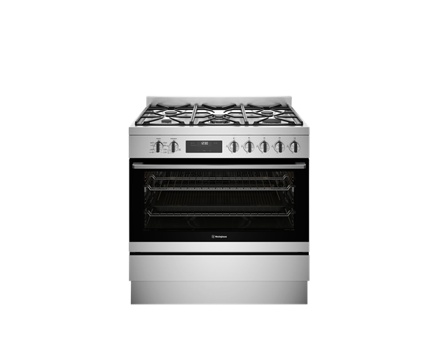 90cm dual fuel freestanding oven with 5 burner gas cooktop, multi-function 8 oven with Twin Fan, and 125L gross capacity.